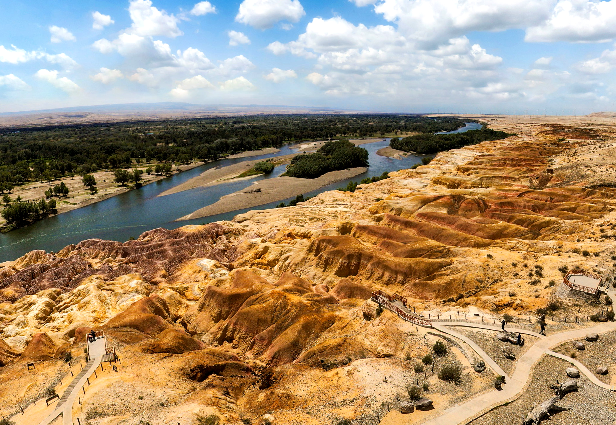 額爾齊斯河畔的雅丹奇跡。一河隔開,南岸是郁郁蔥蔥的河谷胡楊林,北岸則是色彩絢麗的懸崖式雅丹地貌。尤其在日落時分,夕陽的余暉為這些由紫紅、土紅、淺黃、淺綠等泥巖、砂巖構(gòu)成的石丘披上最華美的外衣,光影流轉(zhuǎn),色彩斑斕,宛如上帝打翻的顏料盤,流淌在壯闊的天地之間。