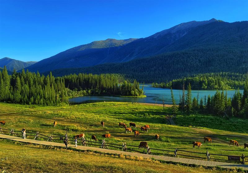 天山懷抱中的高山冷水湖。湖水清澈見底,透明度極高,在陽光照耀下呈現(xiàn)出令人心醉的藍。湖畔是遼闊的高山草甸,夏季野花如繁星點綴,秋季牧草金黃。遠處雪山連綿,倒映在如鏡的湖面上,牛羊悠然漫步,構(gòu)成一幅寧靜致遠的絕美畫卷,“凈!敝逼鋵。
