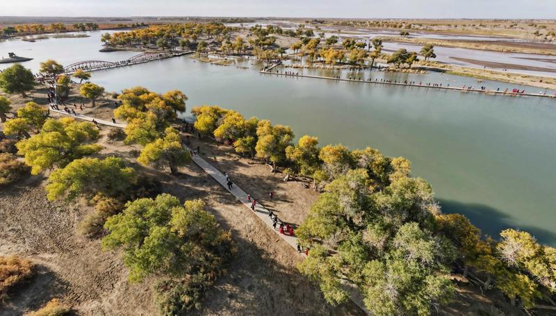 水中胡楊,別具風(fēng)韻。金波湖畔,碧水映金葉,仿佛大自然打翻了調(diào)色盤,成就了荒漠中最靈動(dòng)的秋日童話。