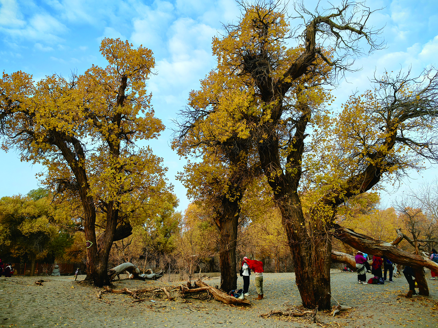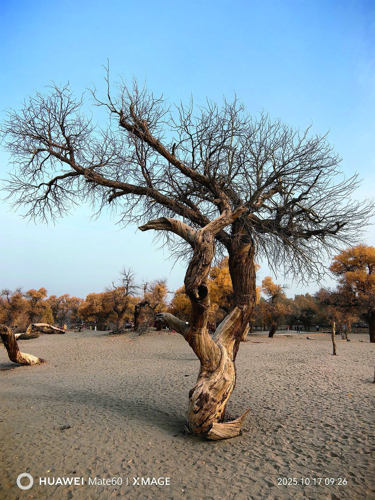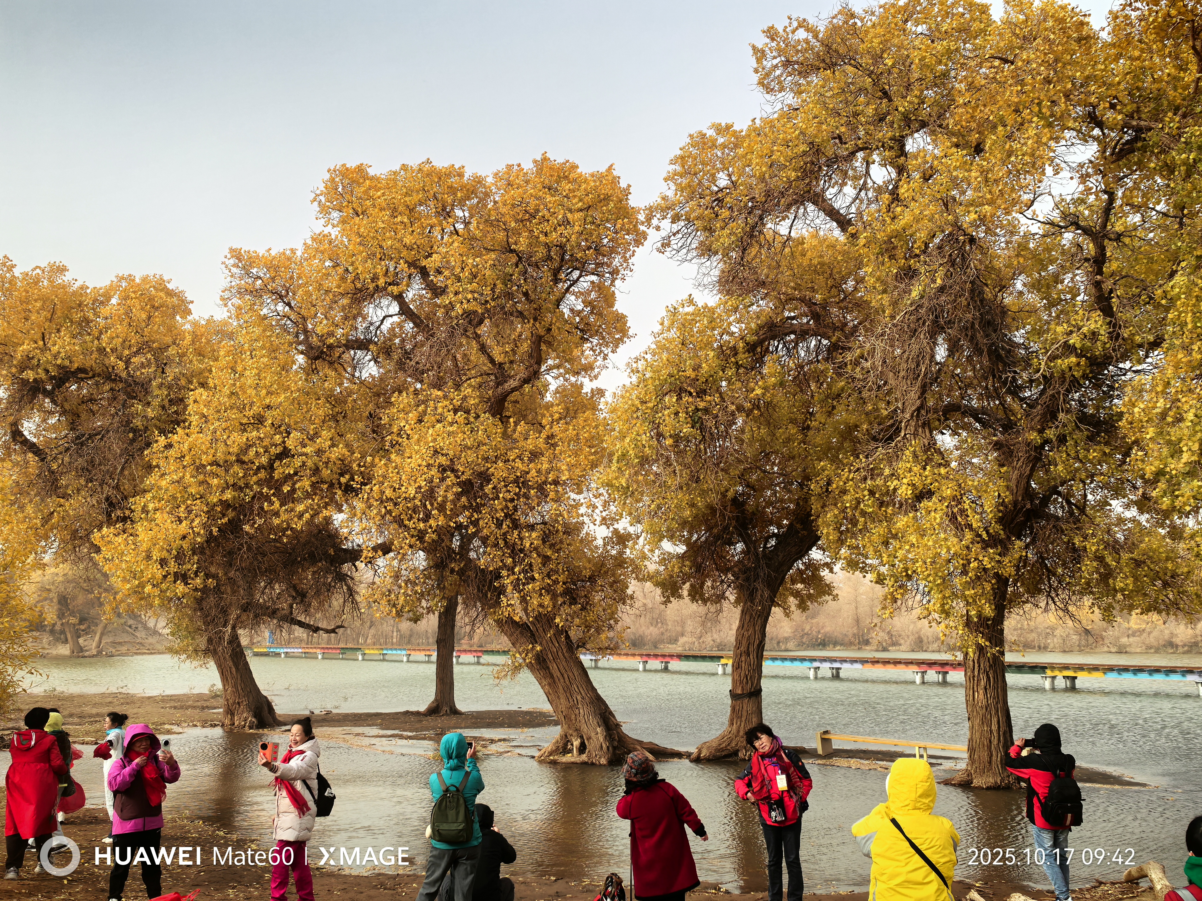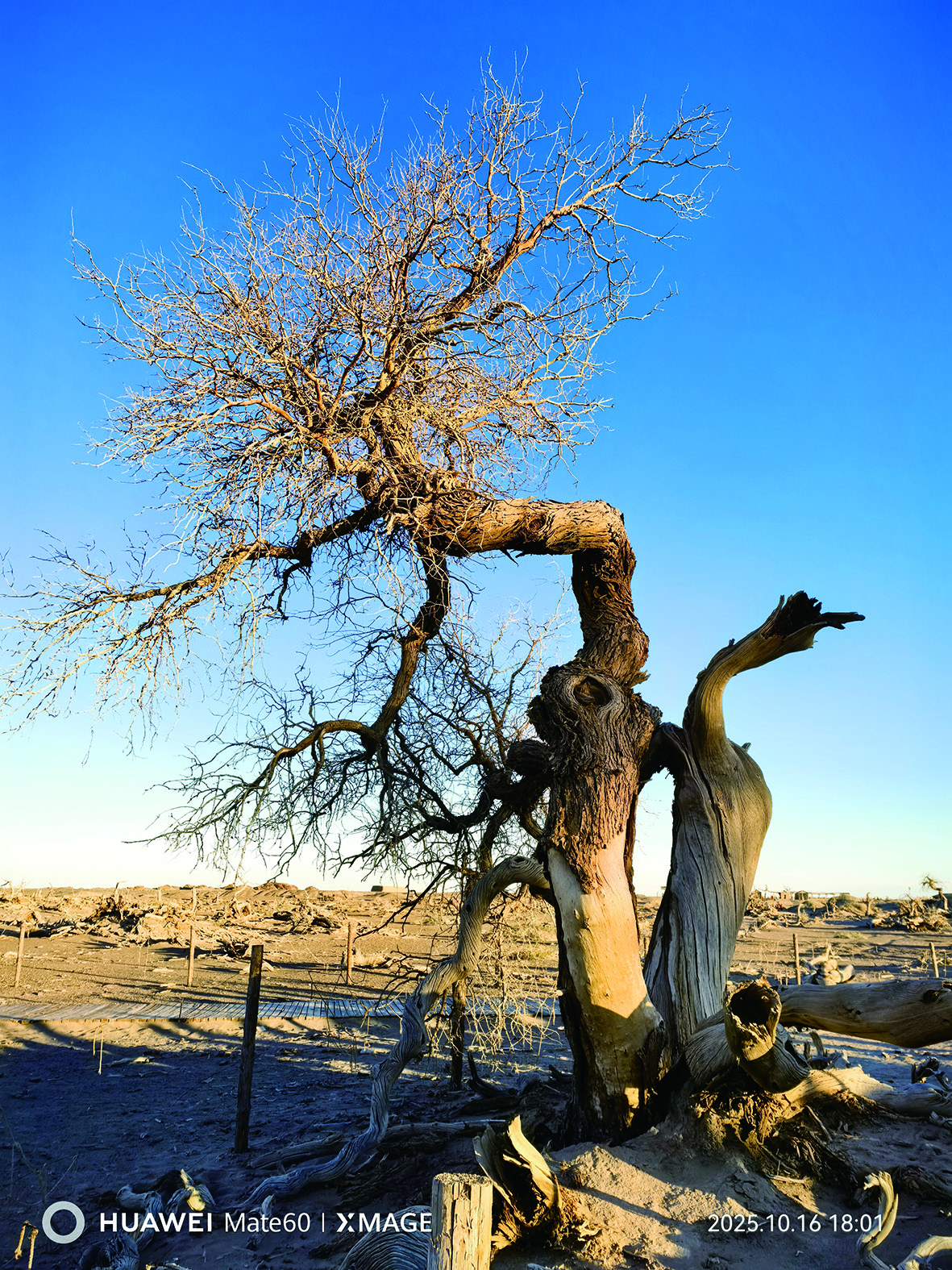 按照行程安排,他們先探訪了額濟(jì)納旗八道橋胡楊林景區(qū)!皬囊坏罉虻剿牡罉,每道橋景色都不一樣!惫鸷突貞洠罉虻乃泻鷹盍肿钍切忝,金色的胡楊倒映在黑河中,波光與樹影交織;四道橋被稱為“英雄林”,千年胡楊樹干粗壯、形態(tài)蒼勁。