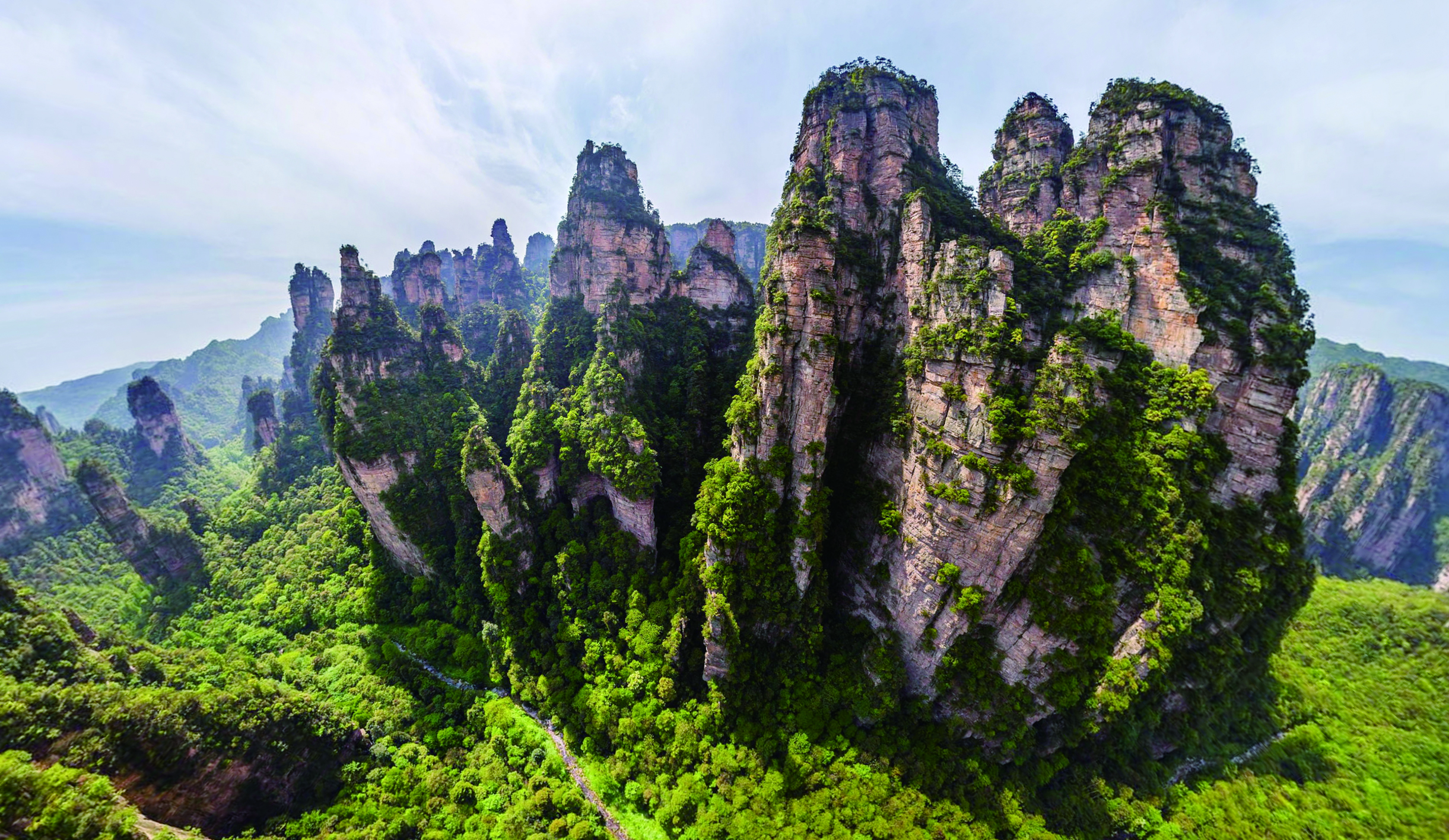 這座森林公園藏著億萬(wàn)年的地質(zhì)密碼。約3.8億年前的泥盆紀(jì)石英砂巖,經(jīng)地殼抬升與流水侵蝕,造就了3000余根海拔超300米的峰林石柱,如人如獸、如器如物,形象逼真,氣勢(shì)壯觀,有“奇峰三千,秀水八百”之美稱(chēng)。黃石寨的“南天一柱”、金鞭溪的碧水奇石、楊家界的絕壁峰墻,以及66秒直達(dá)山頂?shù)陌冽執(zhí)焯,共同?gòu)成了自然與人文交織的震撼景觀。