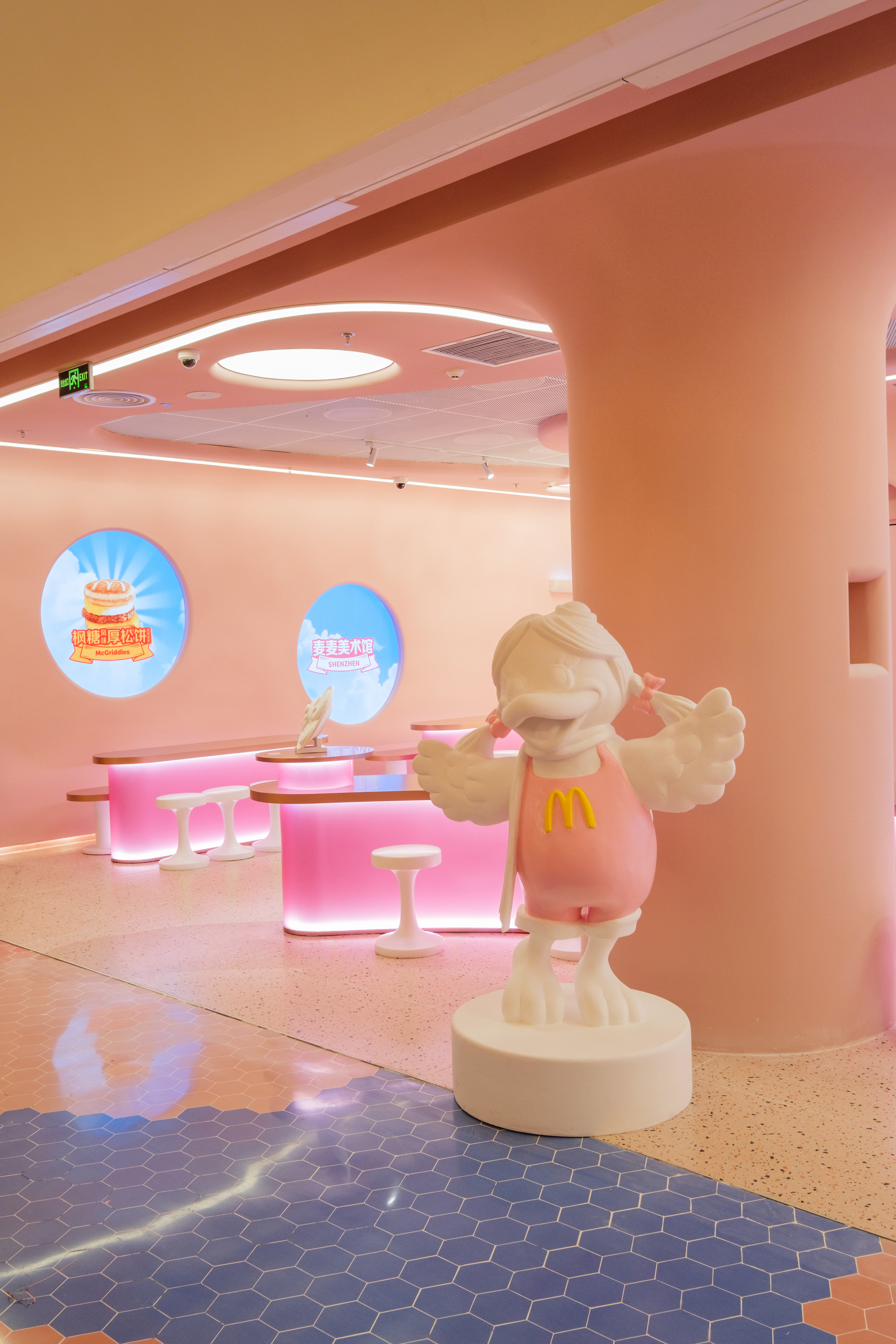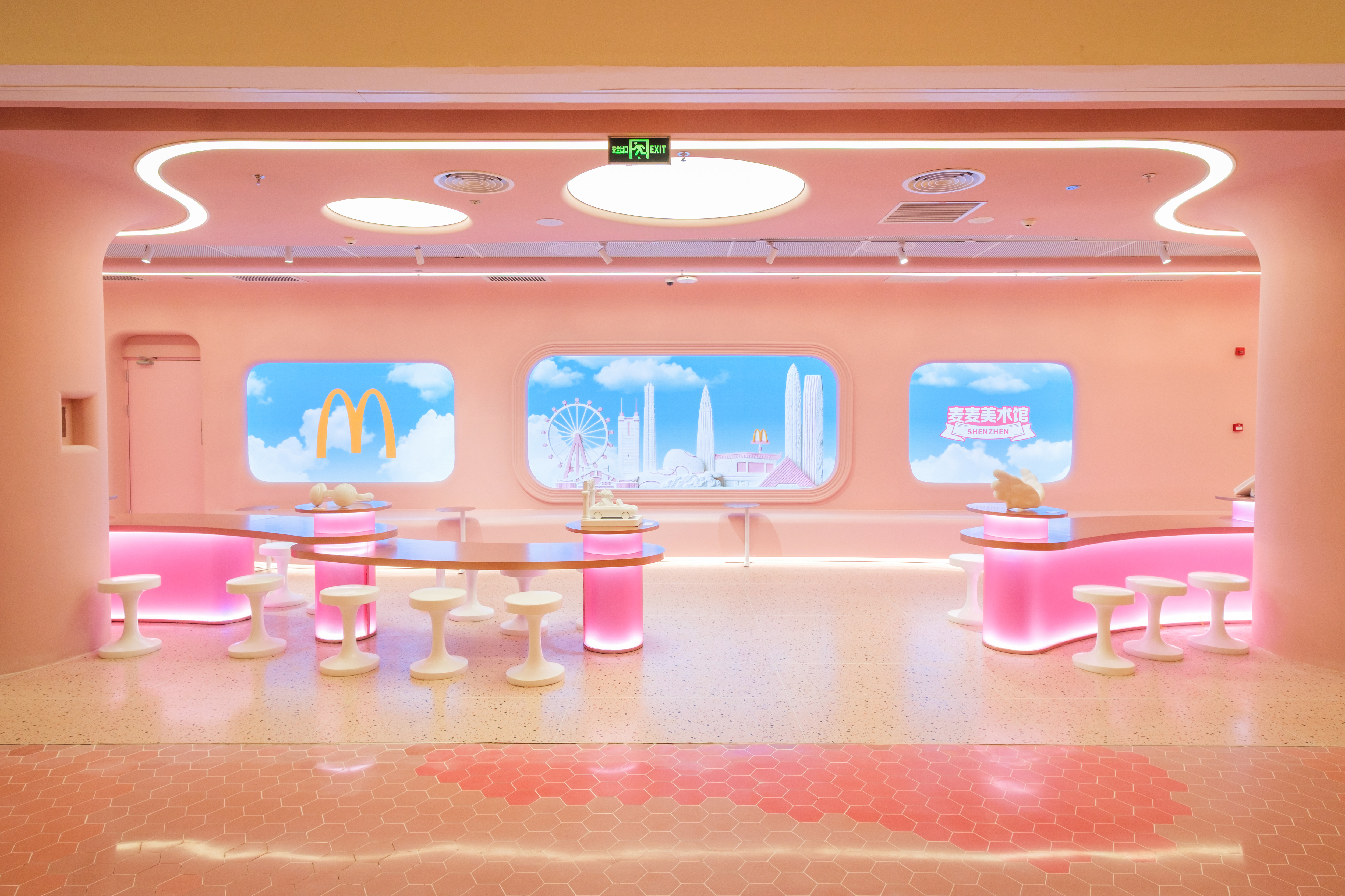 “深圳麥麥美術館”以“未來主義美學”為靈感,采用大鳥姐姐標志性的柔和粉彩為主調,營造出既夢幻又親切的整體氛圍。漢堡、甜筒、薯條等經典元素化身為趣味雕塑與藝術擺件,構成充滿想象力的視覺故事。動態(tài)視頻墻持續(xù)播放流動的數字影像,賦予空間以呼吸感與未來律動,讓藝術的感染力觸手可及。